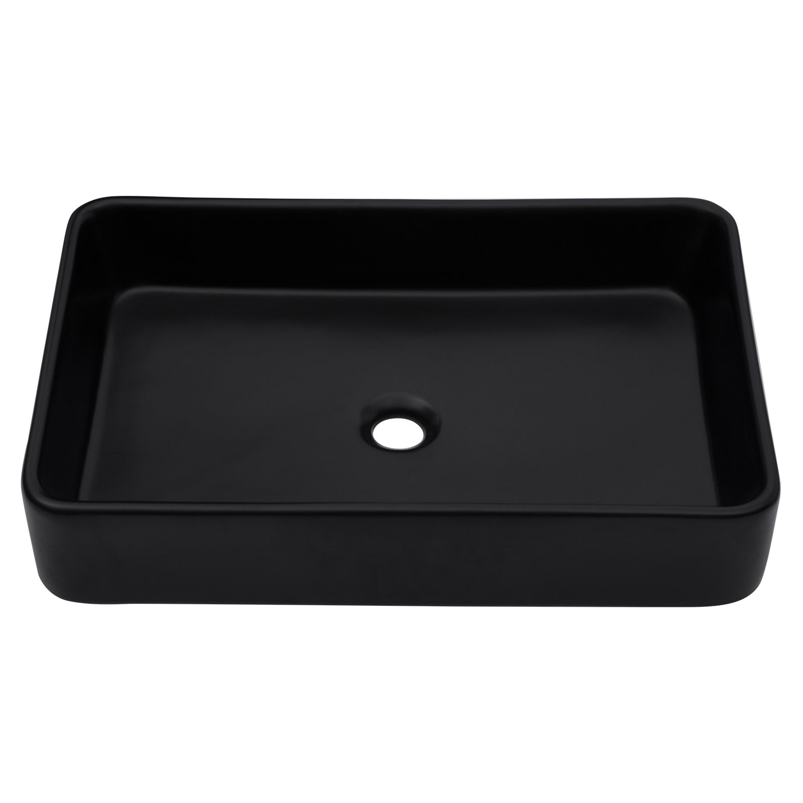 Upgrade your bathroom with this sophisticated 16"x24"x5" black ceramic vessel sink, designed to add a striking contrast to light countertops and an elegant accent to darker décors. Perfect for both compact bathrooms and powder rooms, this sink seamlessly integrates a modern aesthetic with practical function. Its sleek rectangular form complements contemporary spaces and enhances the room’s ambiance. - Constructed from high-grade ceramic, this vessel sink is scratch-resistant and stain-proof, ensuring a lasting, polished look with minimal maintenance. The above-counter design allows easy installation while providing more storage beneath the countertop. Whether you’re renovating your main bathroom or creating a stylish guest bath, this vessel sink enhances small spaces with functionality and visual appeal.